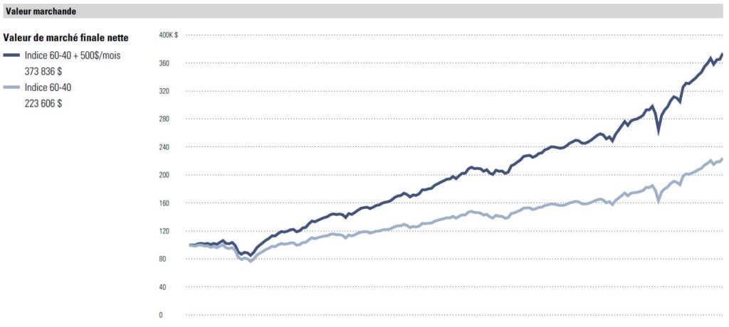 La réponse dépend en fait du point de vue. L’idée d’investir (ou de continuer d’investir) lorsque les marchés baissent demeure une stratégie intelligente, mais encore faut-il avoir un horizon de temps raisonnable. Dans les dernières années, « acheter la baisse » fonctionnait rapidement et à court terme; ce qui explique la montée en popularité de l’expression anglaise « buy the dip ». Cependant, appliquer une stratégie d’investissements systématiques (investir autant lorsque les marchés montent que lorsqu’ils descendent) sur le long terme apporte des bénéfices indéniables. Voici un exemple concret pour l’illustrer.